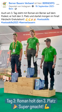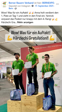 Unsere Sozialen Medien wurden in diesem Jahr von den SwissSkills dominiert. Die drei reichweitenstärksten Beiträge widmeten sich dem landwirtschaftlichen Nachwuchs aus dem Kanton Bern und seinen beeindruckenden Leistungen an den SwissSkills 2025 auf dem Expo-Gelände in Bern Wankdorf.